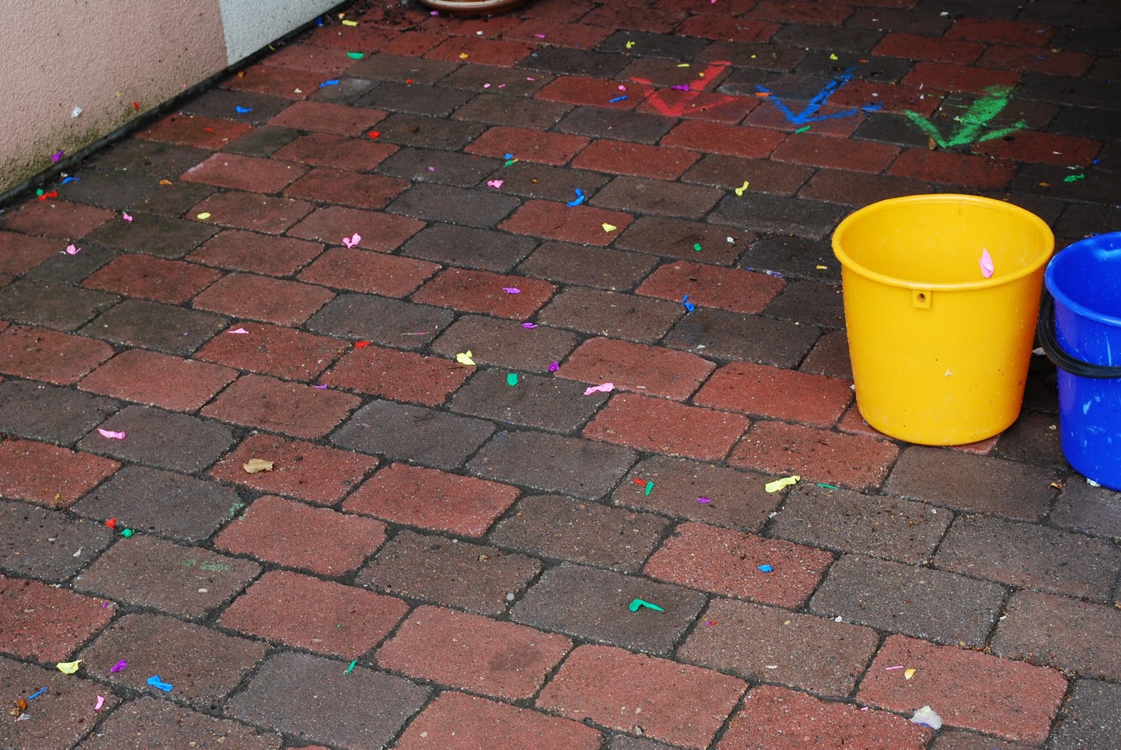 Barnens första uppdrag var att hjälpa vattenälvorna att fylla på vattenförrådet. Vi hade laddat en hel skottkärra full med vattenballonger som barnen fick turas om att kasta från trappavsatsen ner i hinkar. Men fick vara försiktiga så att inte vattenmonstret kom och hällde ut allt igen. När vattenmonstret dök upp fick alla kasta vattenballonger på monstret för att skrämma bort det. Maken dök upp utklädd till vattenmonster och blev rejält blöt. En mycket uppskattad lek ;)